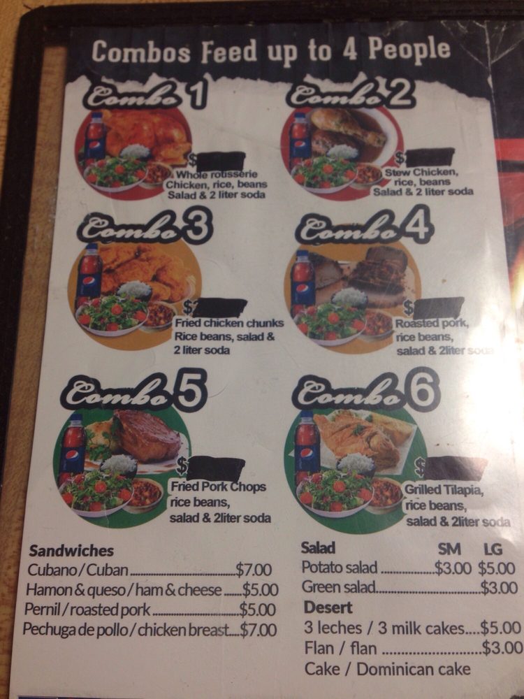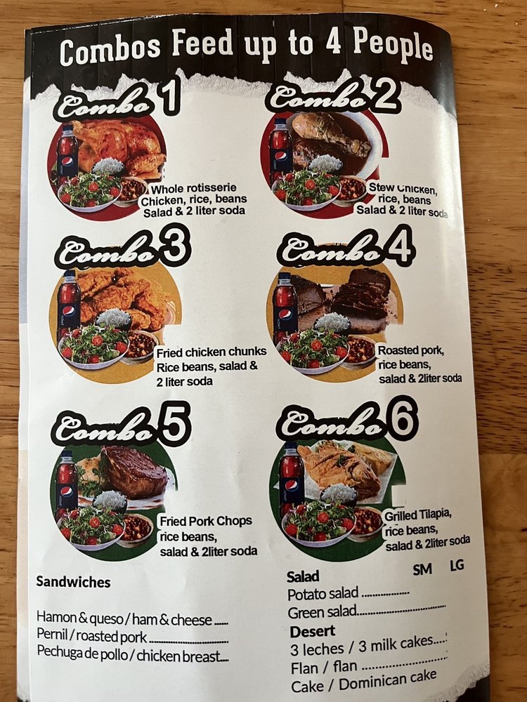 Roast pork, large rice,large beans, salad and 2 liter soda. Pernil , arroz, grande frijoles grande ensalada y soda de 2 litros.